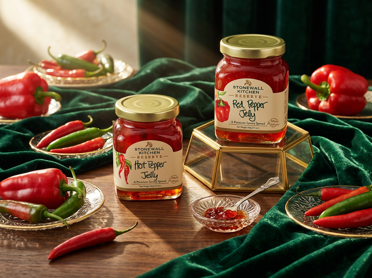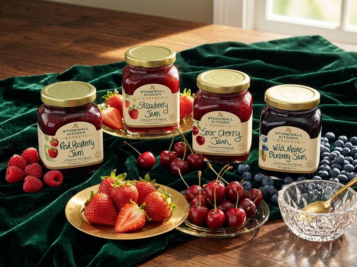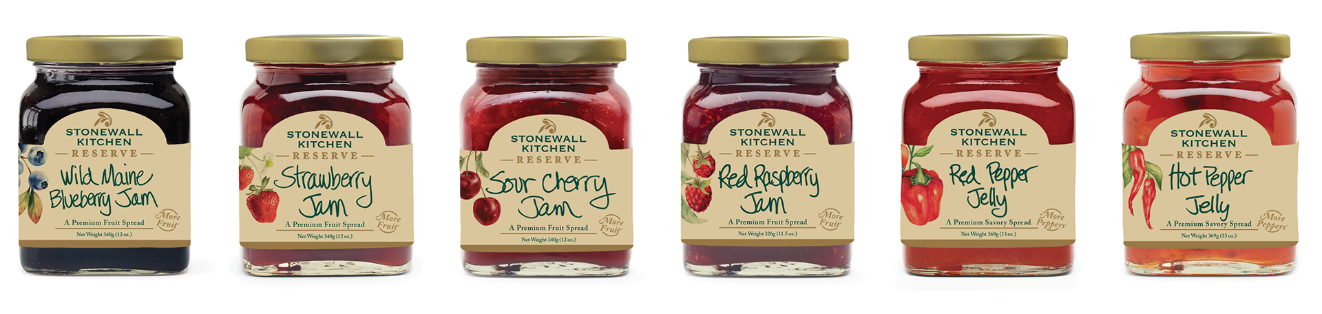 A premium Reserve line designed exclusively for the specialty food market. Leaning into rich cream, gold foil detailing, and classic watercolor fruit illustrations, the packaging signals quality and restraint, a deliberate step up from the core Stonewall Kitchen line while staying true to the brand's warmth.